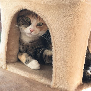 Gaufrette adore les autres chats mais est très craintive vis-à-vis de l’humain. Elle peut être à proximité, surtout si l’humain a une boite de pâtée dans les mains, mais ne veut pas qu’on la touche. Elle ne veut pas de caresses ni d’autre forme de contact.